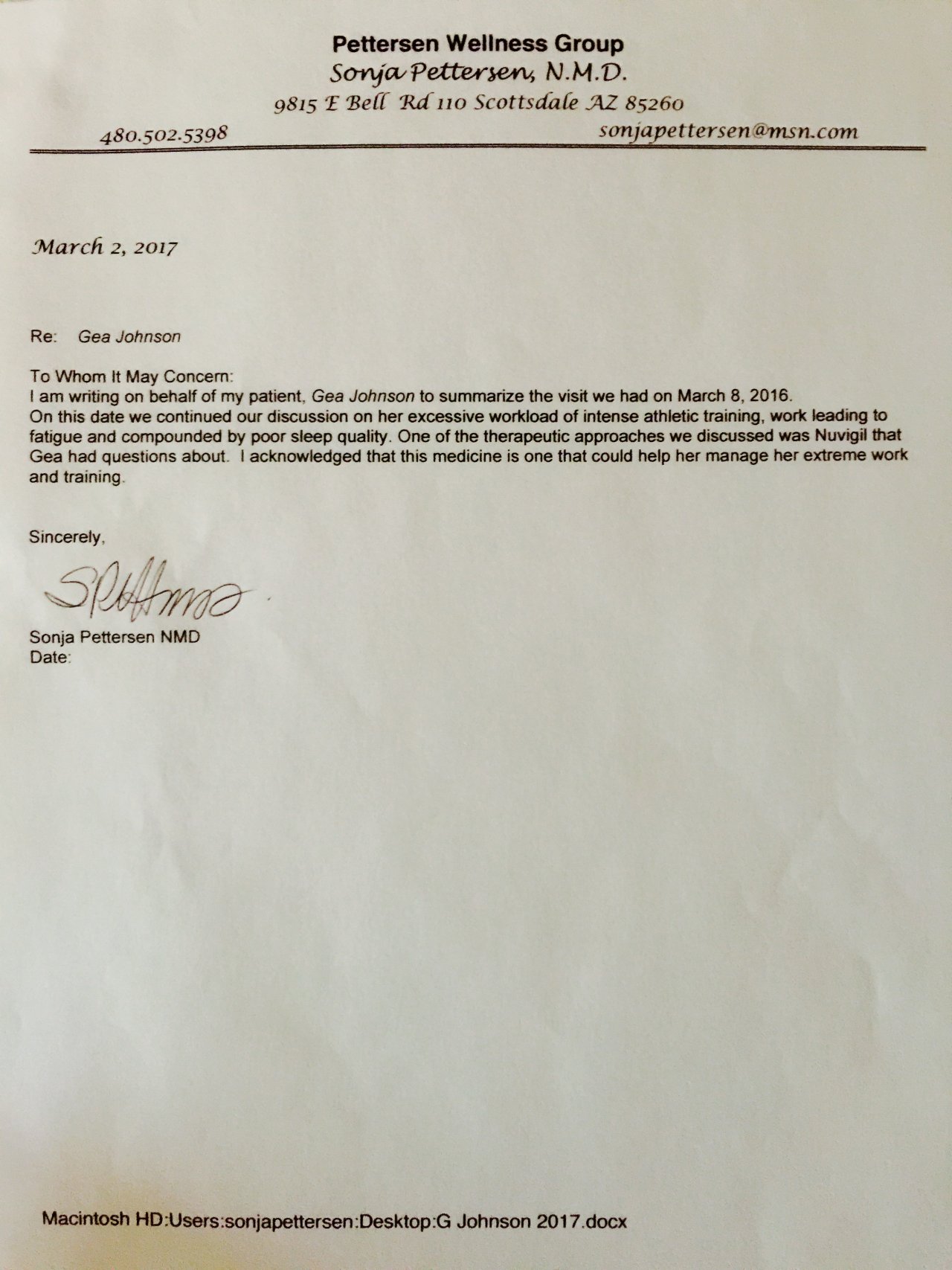 Knowing that she would be competing at the Masters National Track Championships in August, Gea stopped ingesting Nuvigil 5 days prior to her event.